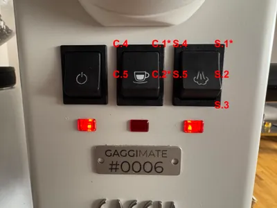 You can choose to retain the functionality of the buttons by using the green/black 4-wire cable from the wiring kit. Connect a green and black wire (check the pinout for steam/brew) to the free sides of both switches (Positions C.1, C.2, S.4, S.5). If you have the monoblock, you should put those back first and then push the connectors in there. Make sure never to mix up high and low voltage on the same side of the switch.